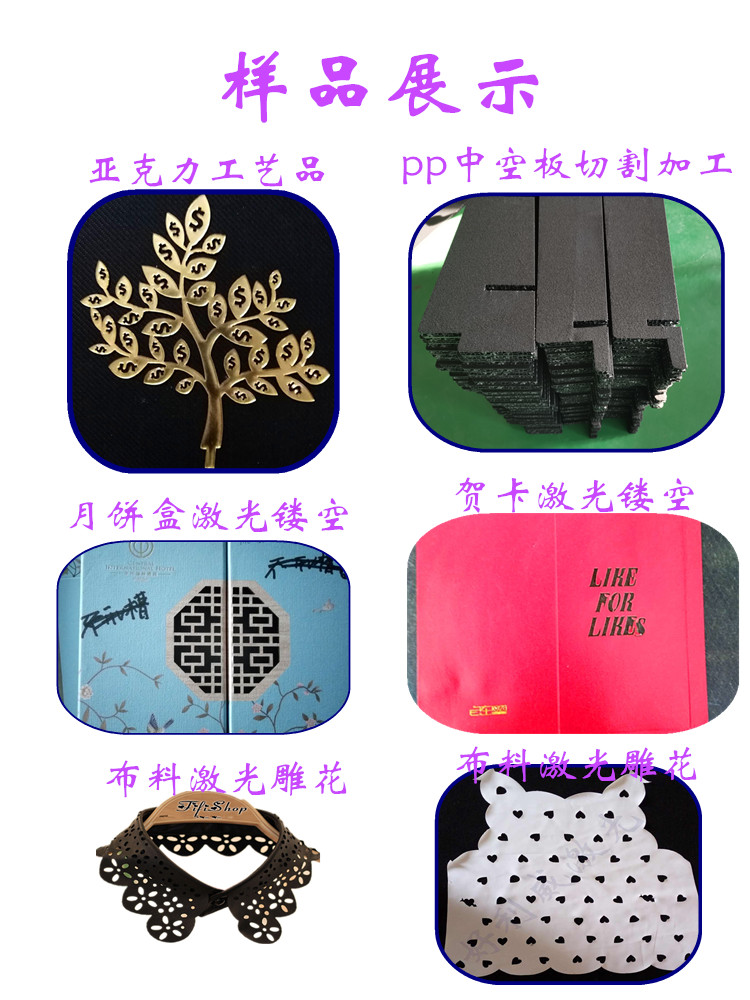本公司專業(yè)對外加工布料切割加工、無紡布毛氈激光鏤空 皮革激光加工、服裝布料激光雕花、麂皮絨激光切割、亞克力,竹木盒月餅盒激光加工,皮革激光雕花等。激光沖孔切割不發(fā)黑不發(fā)黃不發(fā)臭無黑灰”受到眾多客戶認(rèn)可歡迎打樣咨詢。